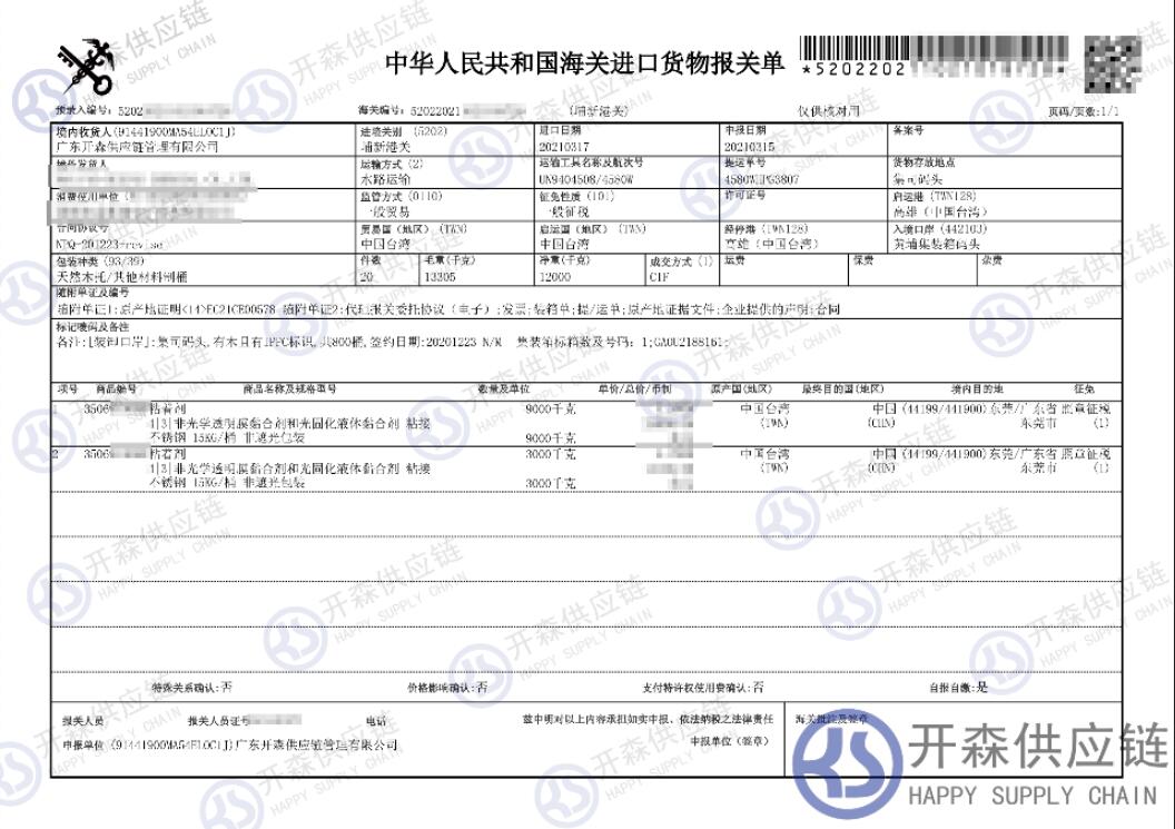 【導(dǎo)讀】您正在閱讀的是關(guān)于臺(tái)灣粘合劑進(jìn)口報(bào)關(guān)清關(guān)代理服務(wù)【經(jīng)典案例】的內(nèi)容,本文由開森化工品進(jìn)口報(bào)關(guān)代理小編整理編寫;