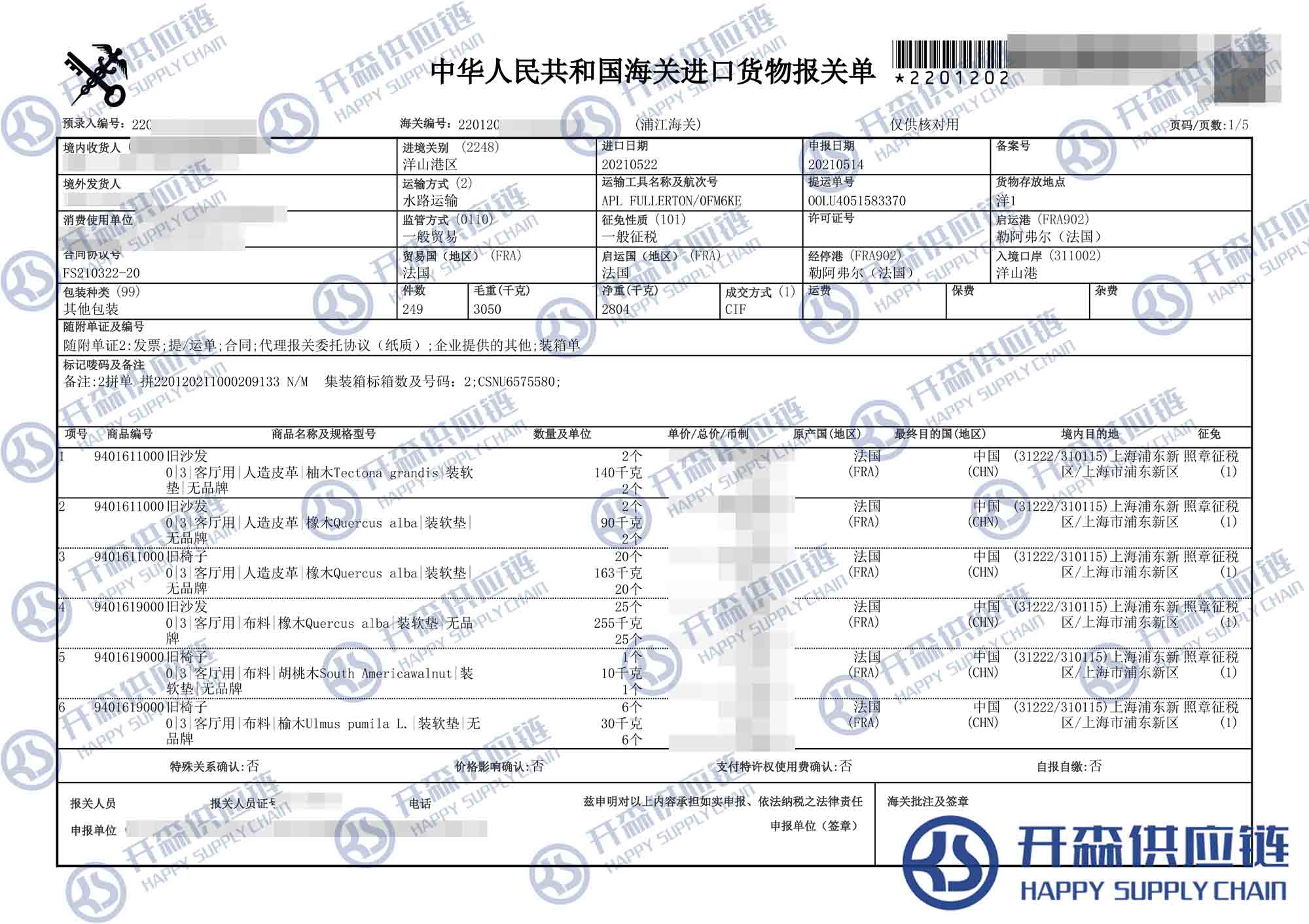 【本文結語】 上述就是法國舊沙發家具進口報關代理服務【清關案例】的全部內容,希望能對您有所幫助,如有二手家具進口報關上任何疑問及問題可隨時在線聯系我們或撥打 18002611553,開森供應鏈擁有豐富的二手家具進口報關操作經驗及案例,10余年進口經驗為您所用,各類進口疑難都能為您一一解答及協助快速處理解決!