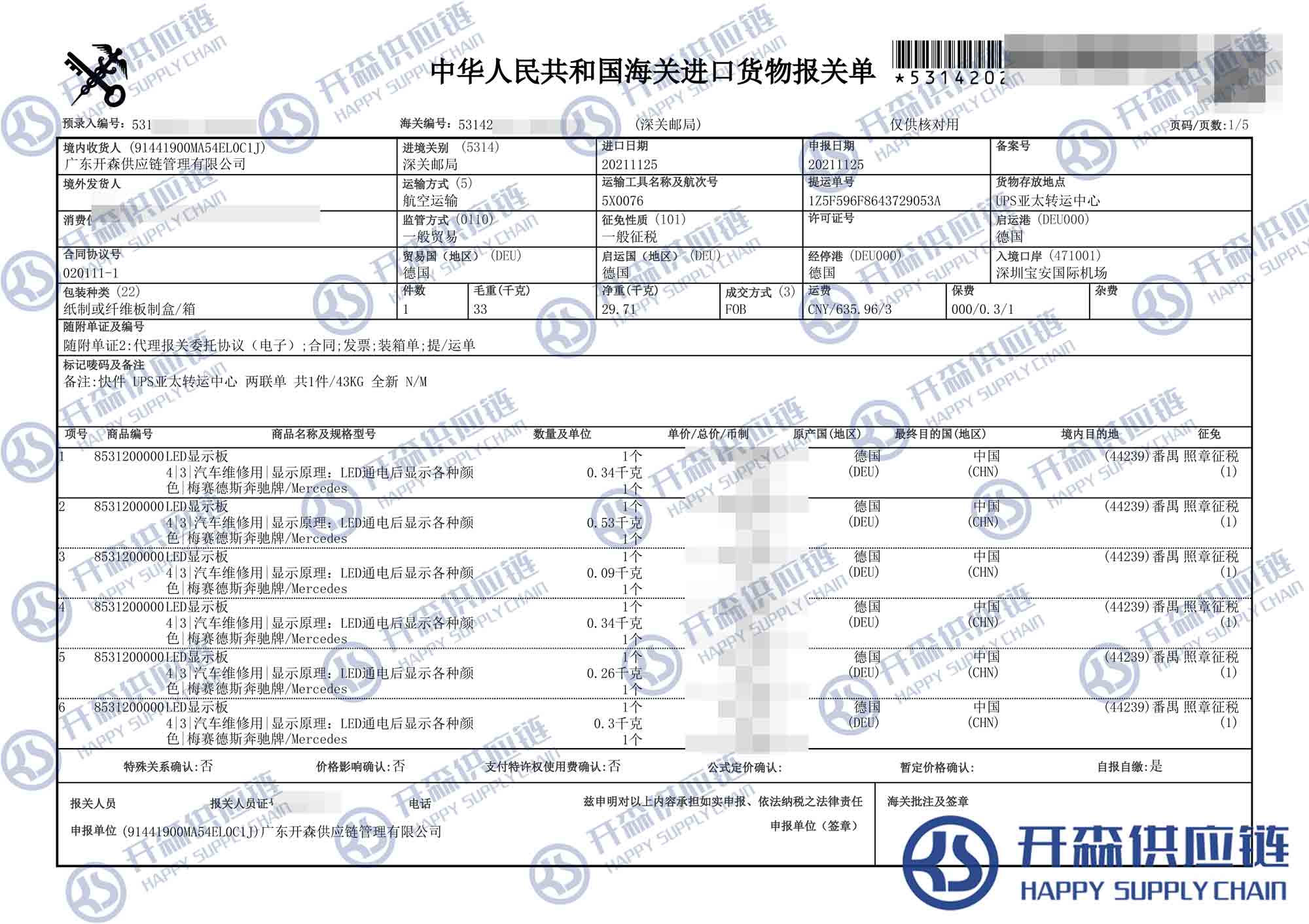 【本文結(jié)語】 上述就是德國奔馳顯示板汽車配件進(jìn)口報關(guān)代理【進(jìn)口案例】的全部內(nèi)容,希望能對您有所幫助,如有汽車配件進(jìn)口報關(guān)上任何疑問及問題可隨時在線聯(lián)系我們或撥打 18002611553,開森供應(yīng)鏈擁有豐富的汽車配件進(jìn)口報關(guān)操作經(jīng)驗(yàn)及案例,10余年進(jìn)口經(jīng)驗(yàn)為您所用,各類進(jìn)口疑難都能為您一一解答及協(xié)助快速處理解決!